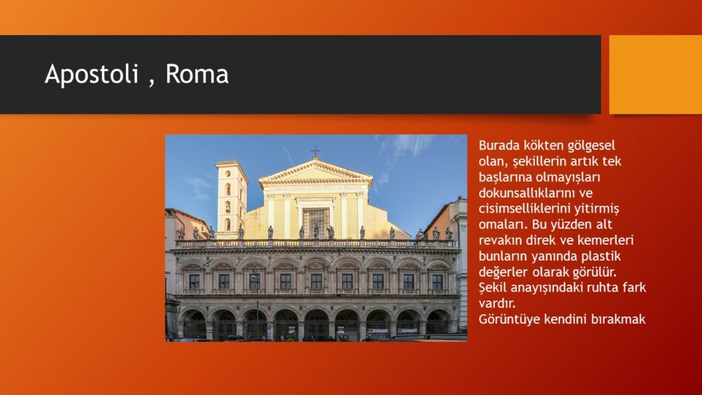• Burada kökten gölgesel olan, şekillerin artık tek başlarına olmayışları dokunsallıklarını ve cisimselliklerini yitirmiş olmaları. Bu yüzden alt revakın direk ve kemerleri bunların yanında plastik değerler olarak görülür.